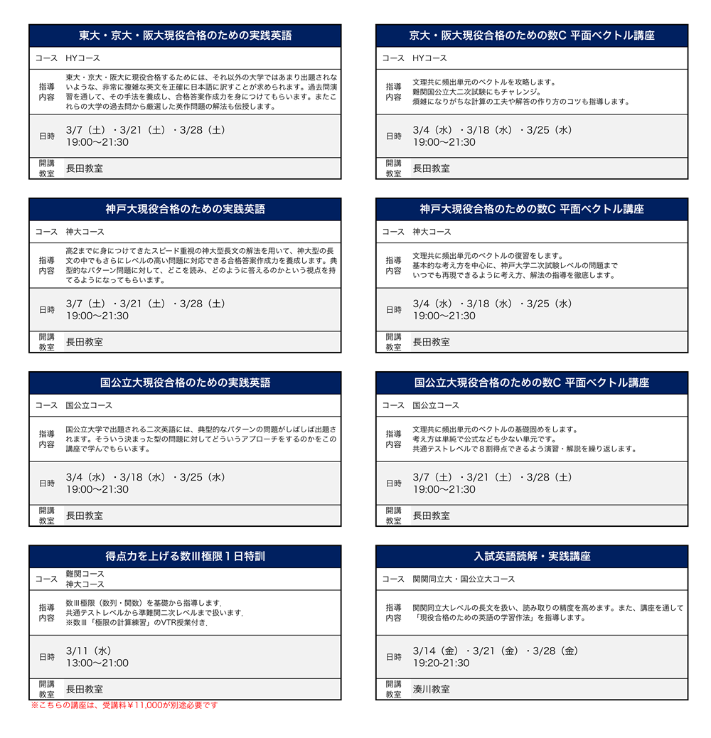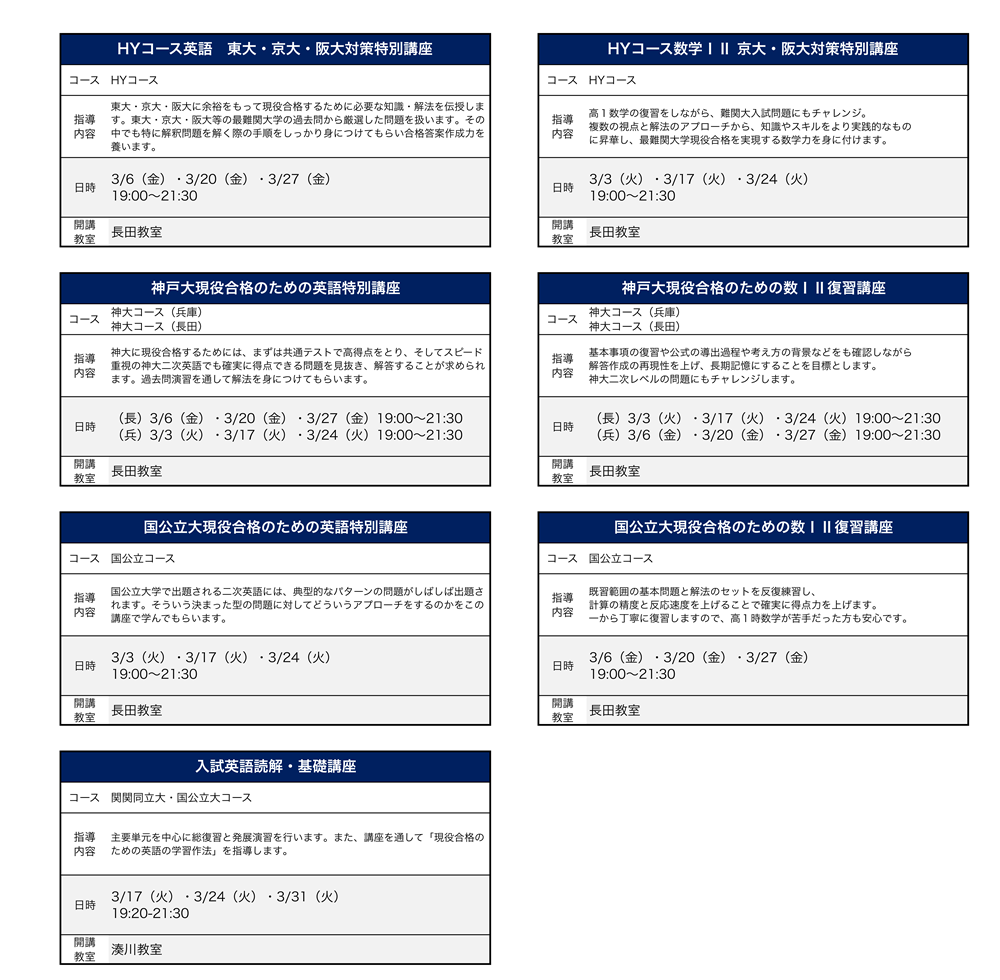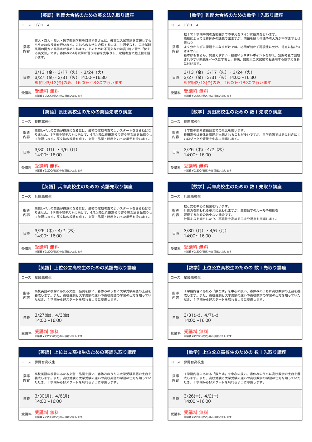 *HYコースは英語と数学がセットになった講座となっております。 *お申込みの講座数に関わらず、一律で「諸費¥2,200」を別途頂戴します