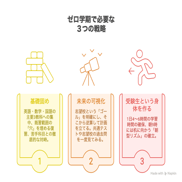 高2の冬休みという「ゼロ学期」にエンジンをかけ、徐々に車輪を動かし始めること。これこそが、高3の4月(1学期)に誰よりもスムーズなスタートダッシュを切るための、唯一にして最強の物理的戦略なのです。
