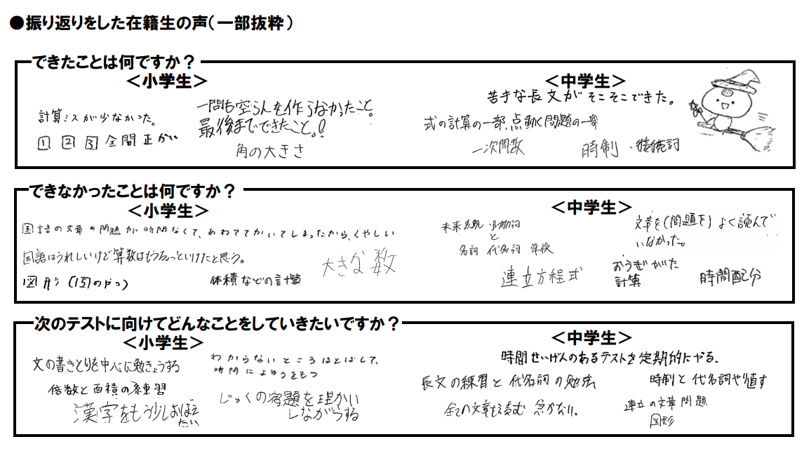 今後、具体的に課題がつかめずに困っていそうなお子様には順次「どの科目をどう伸ばすか」「家庭学習では何に意識を置くべきか」などの学習アドバイスを個別に行っていく予定です。