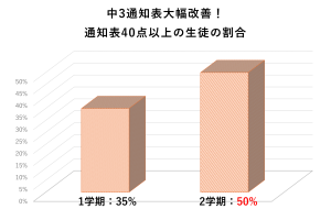 【中3】西神中央通知表の成績アップ実績。40点以上が35%→50%に大幅改善!新年度入塾説明会受付中!