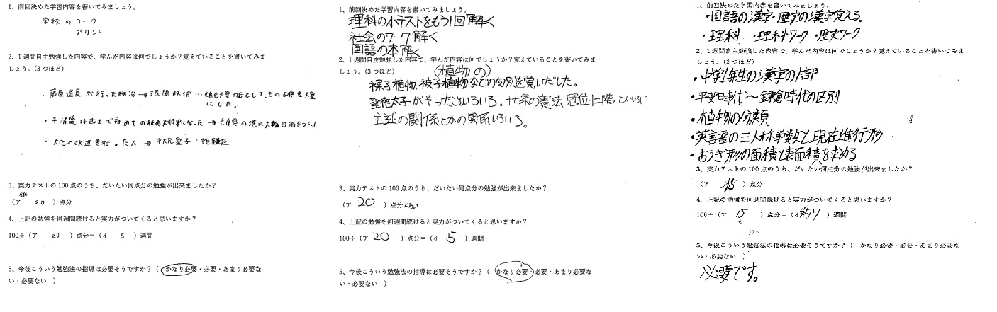 以下は中1生に対して実施した学習法指導についてのアンケートの一例になります。特に、「今後もこういった学習法指導が必要か」という項目については塾生の90%以上が、「必要」あるいは「かなり必要」と答えています。自身の努力の振り返り、方向づけが大切なことがうかがえます。
